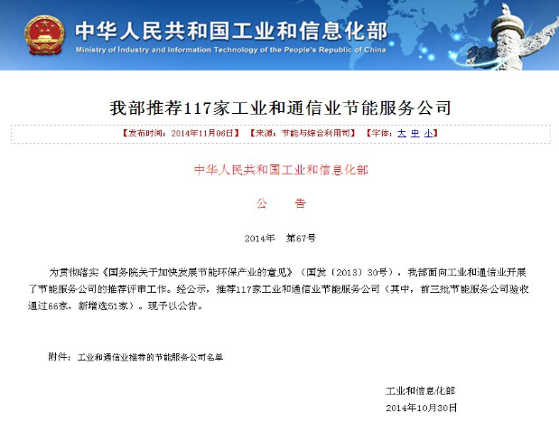 2014年11月4日,國家工業(yè)和信息化部發(fā)布了關(guān)于全國117工業(yè)和通信業(yè)節(jié)能服務(wù)公司推薦名單的公告,我公司憑借在節(jié)能服務(wù)領(lǐng)域的良好業(yè)績,成功入選。這標(biāo)志著公司的技術(shù)服務(wù)能力得到權(quán)威部門及業(yè)界的認(rèn)可為公司的進(jìn)一步發(fā)展奠定了良好的基礎(chǔ)。