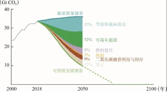 圖1 面向2度目標(biāo)的能源系統(tǒng)減排二氧化碳主要途徑分析