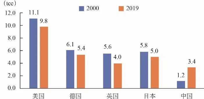 圖2 2000年與2019年中國(guó)和典型發(fā)達(dá)國(guó)家人均能源消費(fèi)量